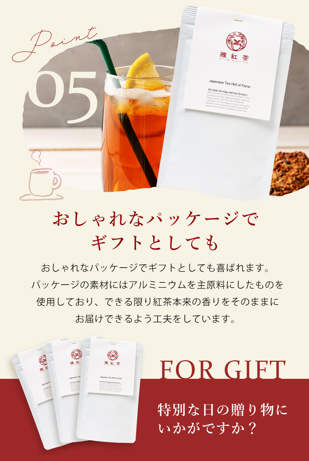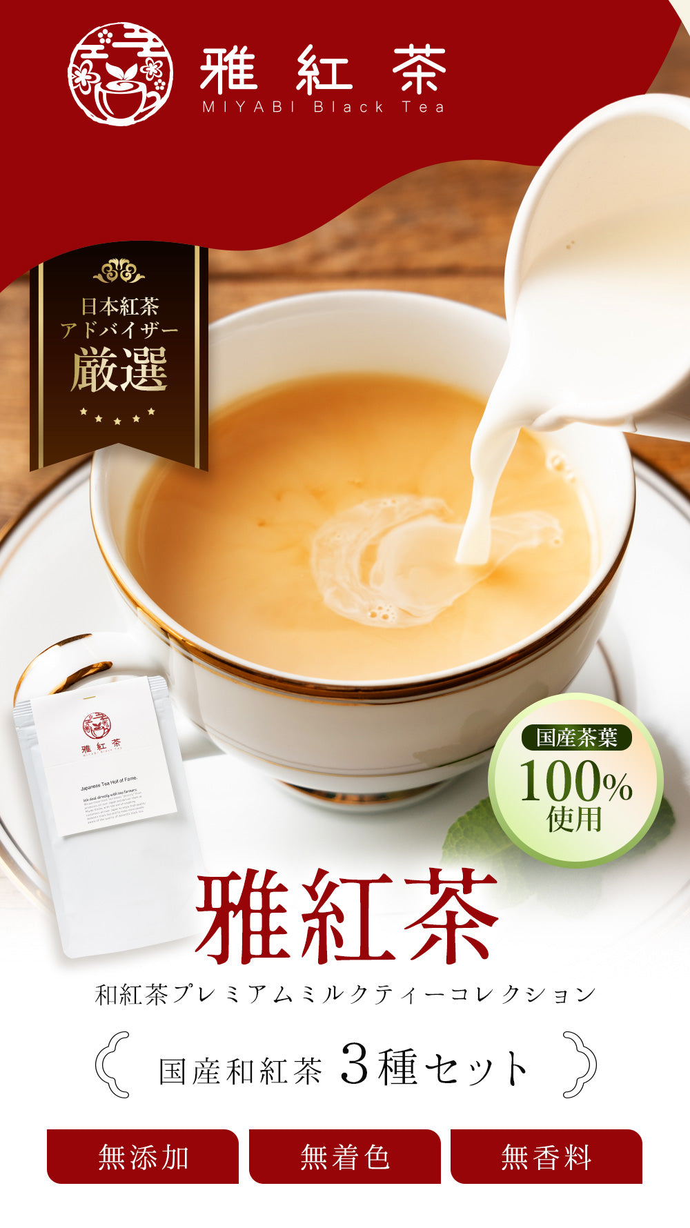 雅紅茶公式ショップの「和紅茶プレミアムミルクティーコレクション」は、ミルクティーに最適な紅茶を厳選した贅沢なセットです。 国産茶葉100%使用で、無添加・無着色・無香料の安心品質。 日本の紅茶文化を支える農家を応援しながら、あなたの温活をサポートします。 至福のティータイムをお楽しみください。 3パック×50gの計150gで、心温まるひとときをお届けします。 |