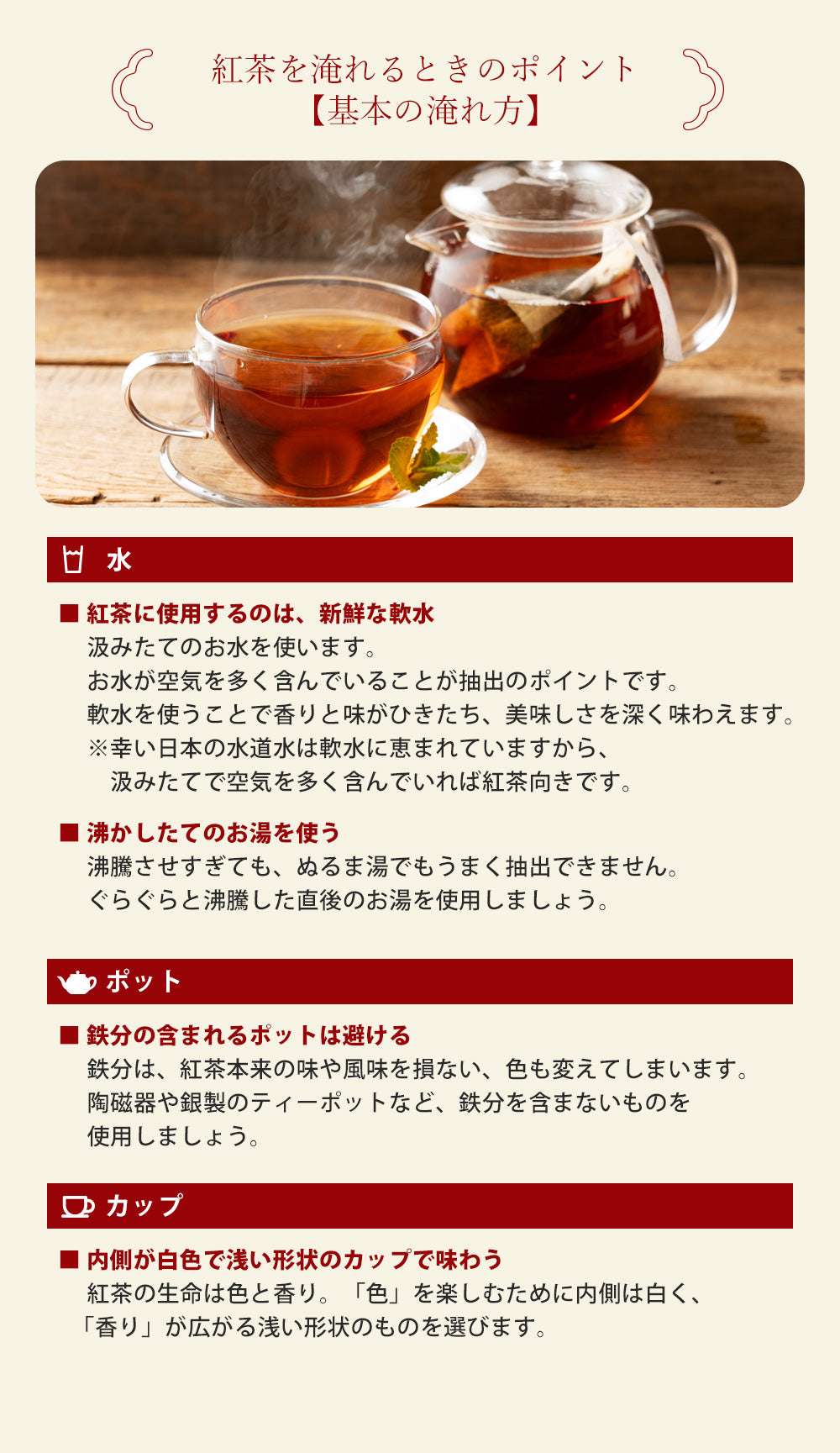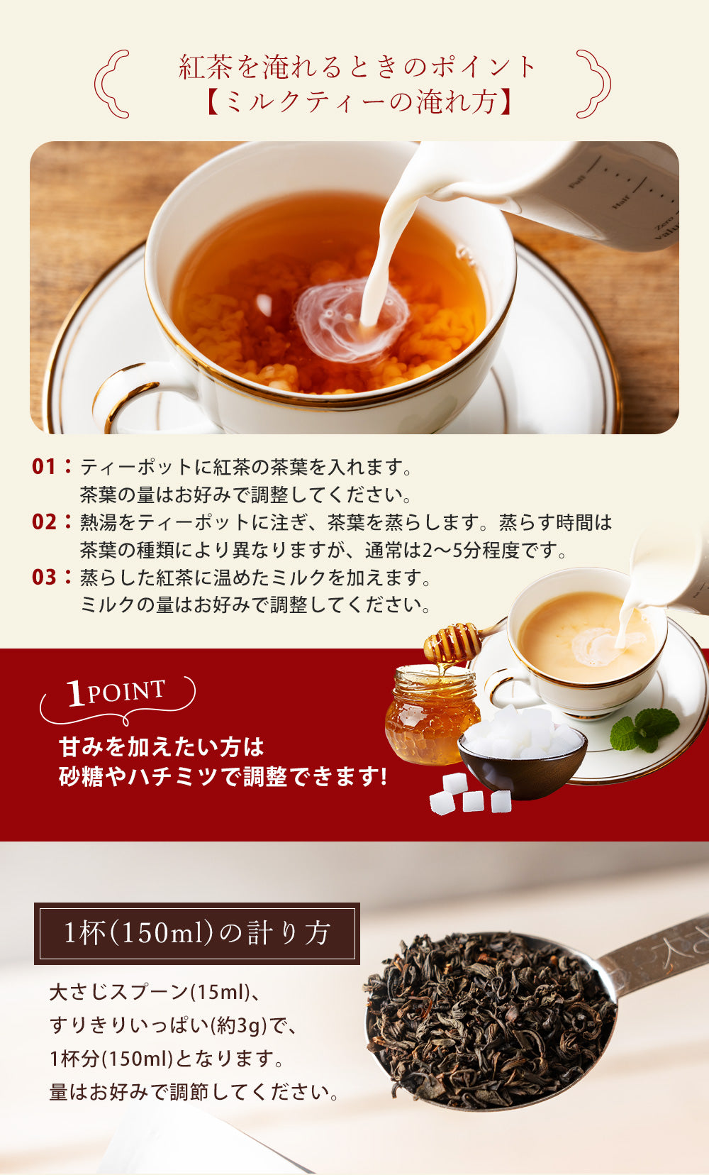 【抽出時間】3分ー5分 お好みに応じて抽出時間をお決めください。 上記時間は目安です。 ご自身のもっとも好きな抽出時間を見つけるのも楽しみの一つです。 ※5分のほうが若干ではありますが渋みが増します。 ※ミルクティーでお楽しみいただく場合は長めの抽出時間をお勧めします。(お好みではあります) |