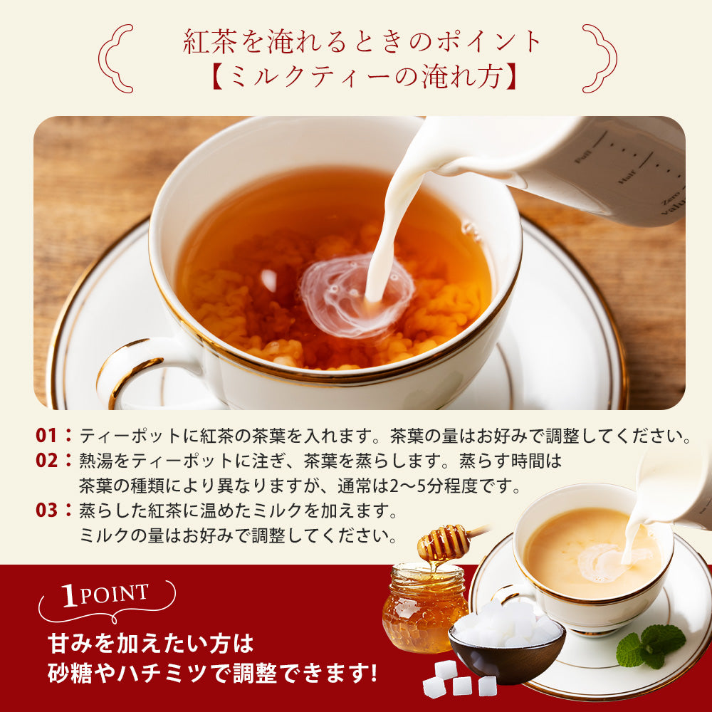 どれが入っているかは、届いてからのお楽しみです! どの銘柄の紅茶もミルクティーにぴったり。 |